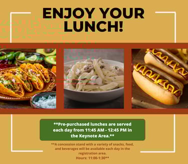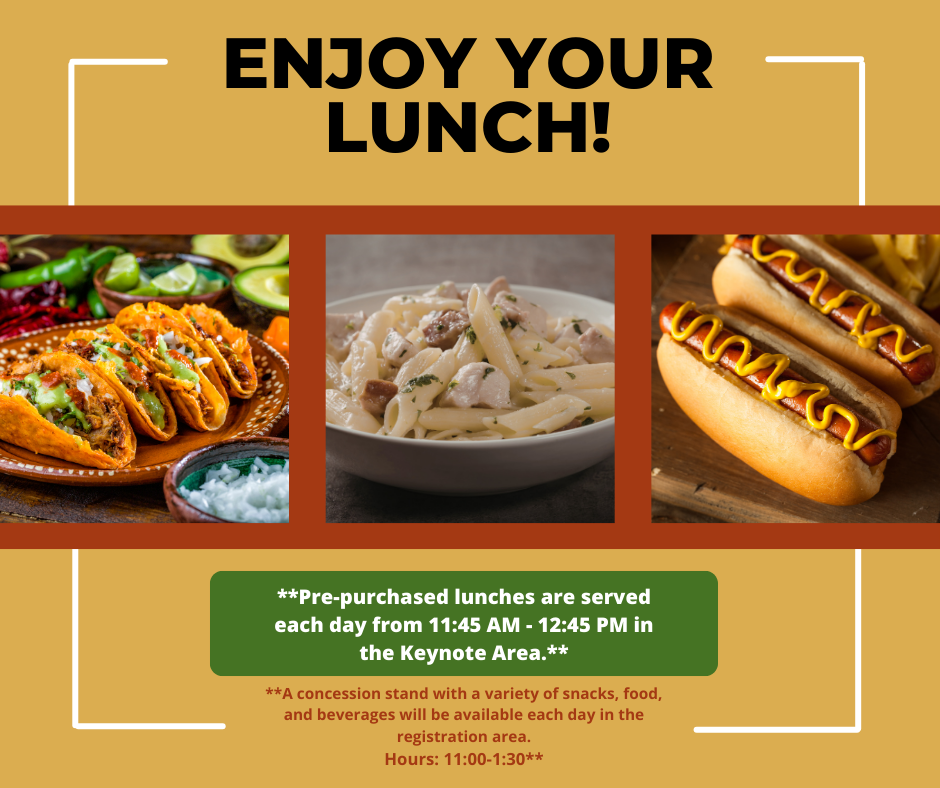 The link to pre-order your convention lunches is now live! Lunch will be from 11:45 A.M. to 12:45 P.M. in the keynote area. If you prefer not to order lunch, concessions will be available from 11:00 A.M. to 1:30 P.M. You may also leave the venue for lunch. No outside food is allowed. Please respect the rules! The pre-order deadline is February 21st. Your lunch tickets will be in your registration packet or at the registration desk.