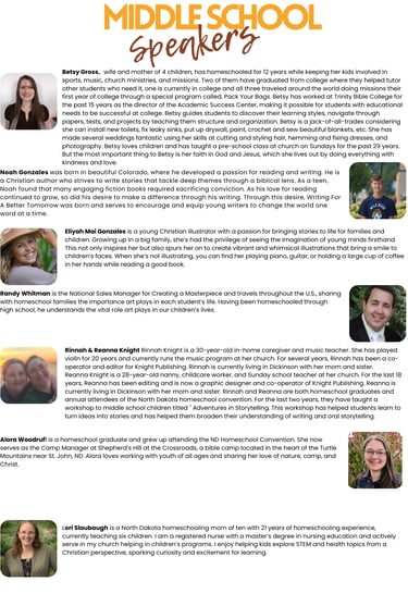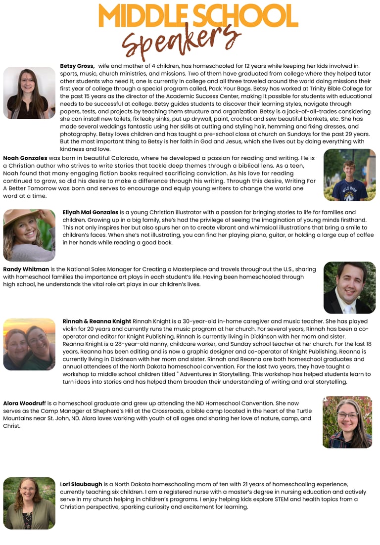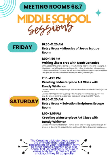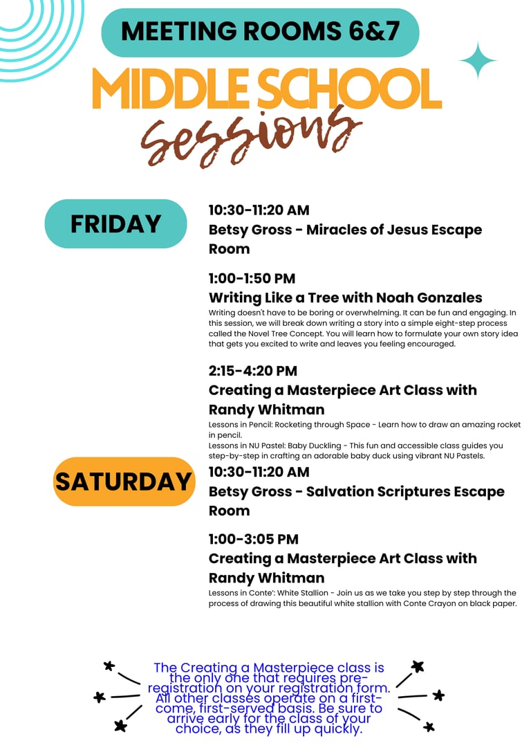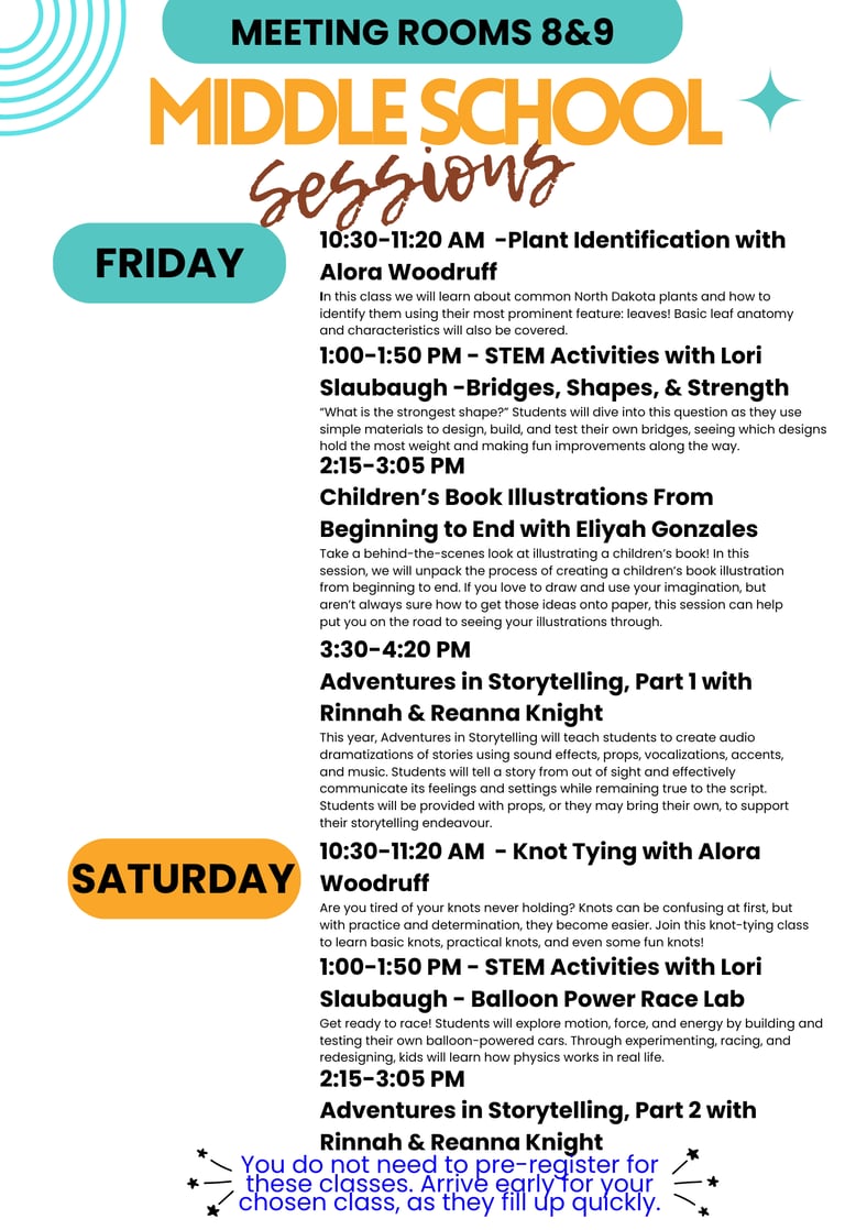 Wonderful Middle School (ages 10-12) sessions available this year! The only sessions that require pre-registration are those with Randy Whitman; you can register for those only through the convention website's attendee pre-registration form. The others are on a first come fist serve basis. Try to arrive early for your chosen session, as sessions fill up quickly.