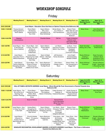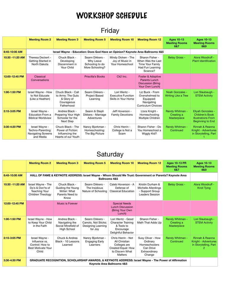 The white sections are keynote and general sessions, and the pink sections represent Vendor Sessions. Please note that the schedule is subject to change, so check back for updates. Middle School (ages 10-12) sessions are in green.