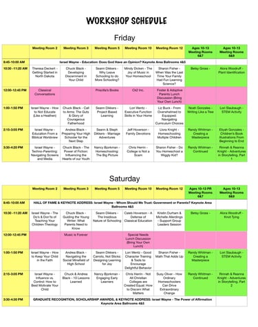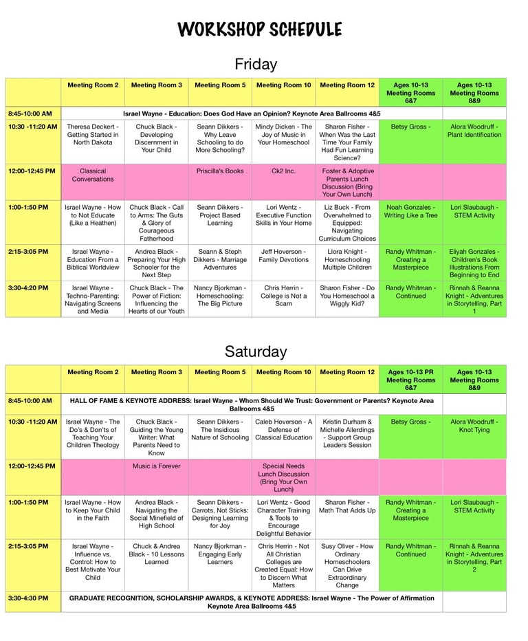 The white sections are keynote and general sessions, and the pink sections represent Vendor Sessions. Please note that the schedule is subject to change, so check back for updates. Middle School (ages 10-12) sessions are in green.