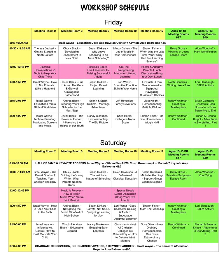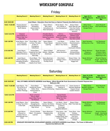The white sections are keynote and general sessions, and the pink sections represent Vendor Sessions. Please note that the schedule is subject to change, so check back for updates. Middle School (ages 10-12) sessions are in green.